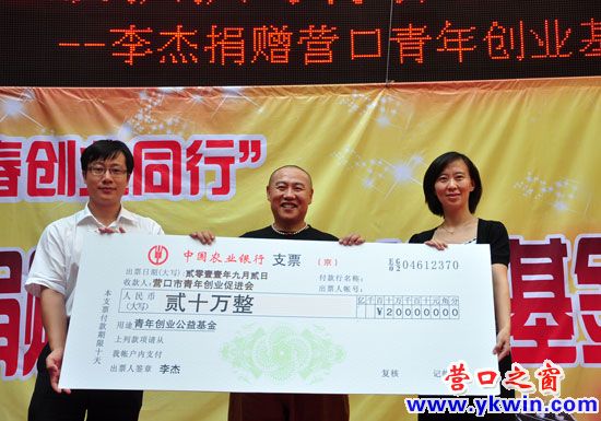 9月2日下午2點(diǎn),著名音樂人李杰回到了闊別27年的故鄉(xiāng)——營口,并在青少年宮一樓大廳向營口市青年創(chuàng)業(yè)促進(jìn)會(huì)捐贈(zèng)人民幣20萬元,作為營口市青年創(chuàng)業(yè)促進(jìn)會(huì)創(chuàng)業(yè)基金。營口市青年創(chuàng)業(yè)促進(jìn)會(huì)會(huì)長孫文夫、團(tuán)市委領(lǐng)導(dǎo)、YBC創(chuàng)業(yè)導(dǎo)師及相關(guān)單位領(lǐng)導(dǎo)等60余人出席此次捐贈(zèng)儀式。