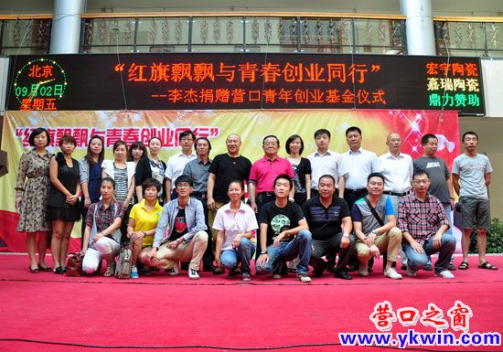 儀式最后李杰與創(chuàng)業(yè)青年和領(lǐng)導(dǎo)來賓合影留念,整個(gè)捐贈(zèng)儀式在那首的經(jīng)典的“紅旗飄飄”歌聲中圓滿結(jié)束。