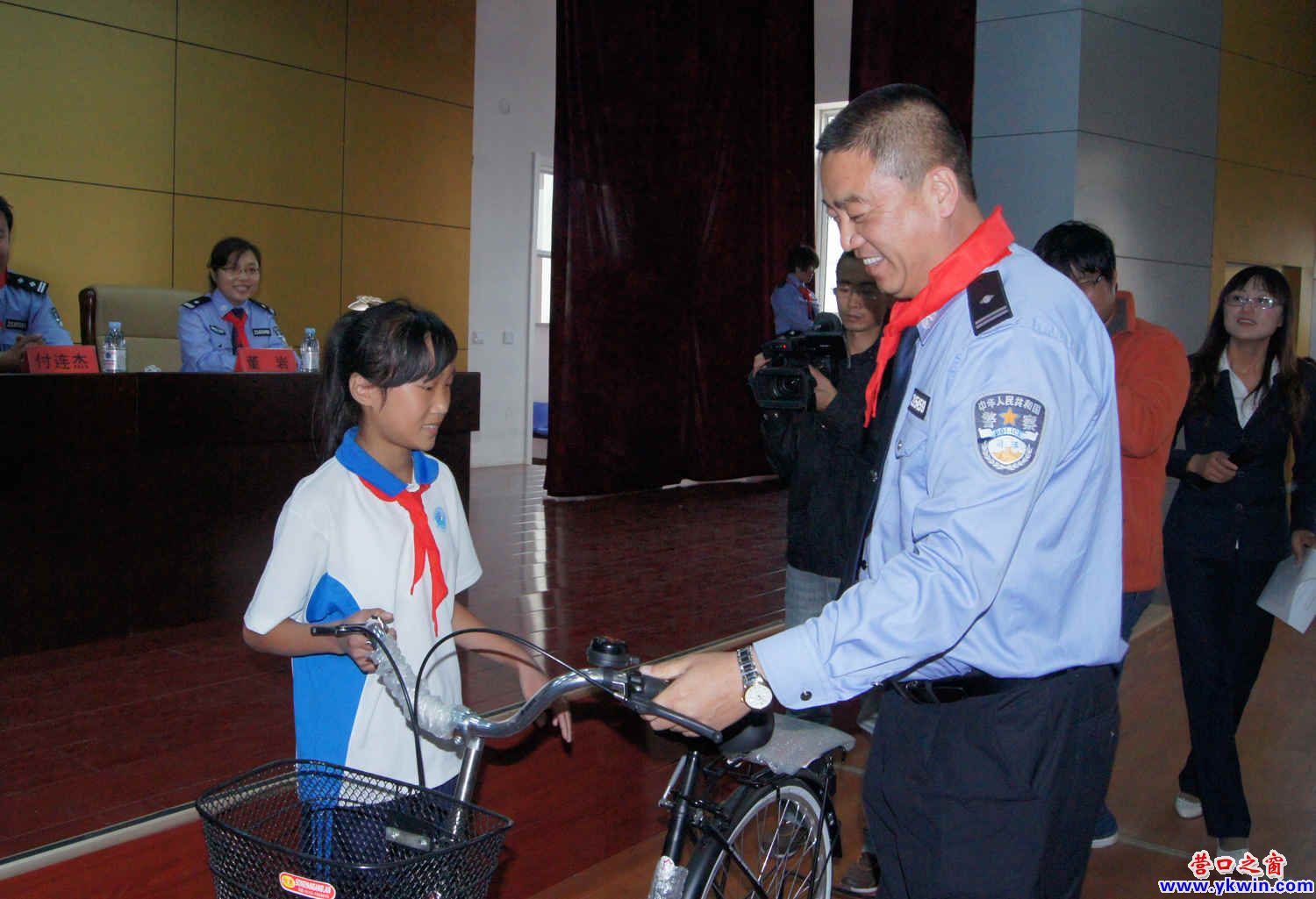 9月28日,營口監(jiān)獄警官向留守兒童贈送自行車,圓了小姑年一個夢想;