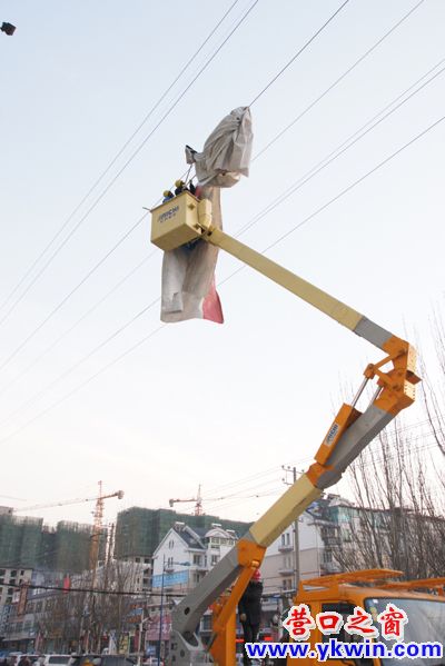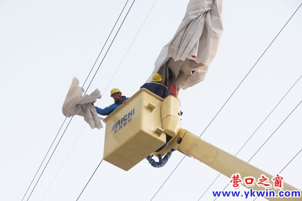 營(yíng)口供電公司運(yùn)檢部的工作人員經(jīng)過(guò)三個(gè)多小時(shí)的搶險(xiǎn),將一塊纏繞在66千伏高壓線上的破損廣告布分解撤到地面。