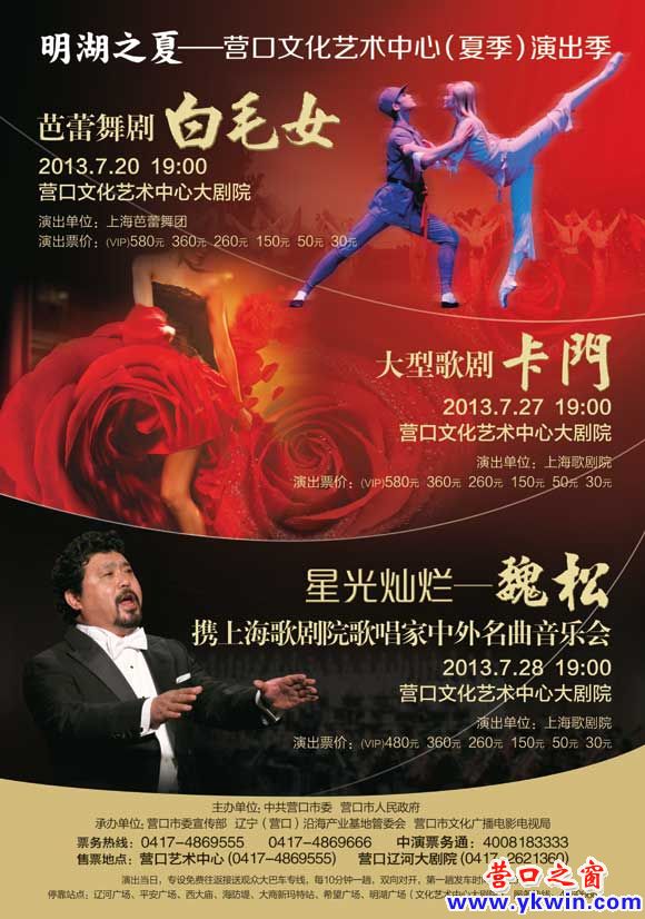 此次演出季活動(dòng)我們將依托營(yíng)口市委、市政府推出的““明湖之夏---2013 廣場(chǎng)文化活動(dòng)”活動(dòng),推出芭蕾舞劇《白毛女》、歌劇《卡門》、《星光燦爛—魏 松攜上海歌劇院歌唱家中外名曲音樂會(huì)》等一批高雅的經(jīng)典?。ü?jié))目,將市民休閑文化和高雅藝術(shù)欣賞有機(jī)結(jié)合起來,將營(yíng)口文化藝術(shù)中心打造成為營(yíng)口河海文化名城新的制高點(diǎn),讓營(yíng)口市藝術(shù)中心成為這座城市一張全新的文化名片。