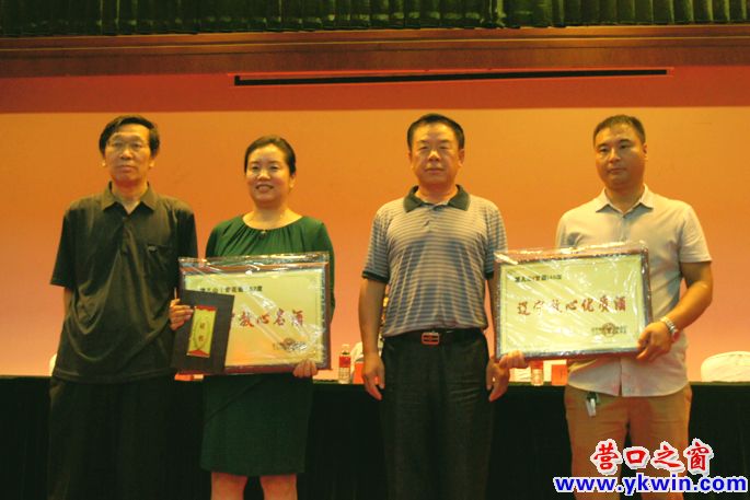 望兒山酒業(yè)公司總經(jīng)理寧素英(左二)和副總經(jīng)理李建榮(右一)接過榮譽證牌。
