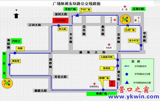 東線??空军c(diǎn):火車(chē)站、人民公園、站前區(qū)政府、長(zhǎng)途客運(yùn)站、營(yíng)口理工學(xué)院