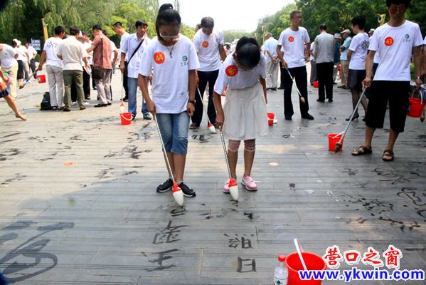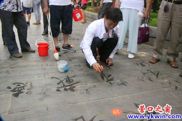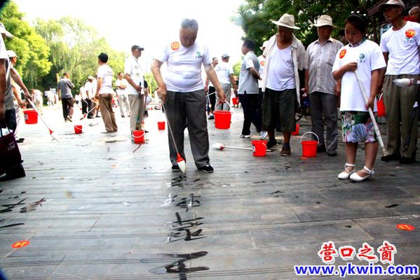 “大地書法”是運(yùn)用特制的大號(hào)毛筆、蘸普通清水在地面書寫的一種書法表現(xiàn)形式,市民簡(jiǎn)而稱之為“地書”。近年來,營(yíng)口市的地書愛好者人數(shù)不斷增多,每至晨昏,在各公園和廣場(chǎng)隨處可以見到地書愛好者練習(xí)的身影。