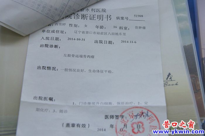 10月中旬,在營口第二高中讀高二的女生肖雪婷上體育課跑步時,突然感覺腿部無力,站立不穩(wěn),而且伴有劇烈的疼痛感。肖雪婷的父親起初以為身體微胖的女兒缺乏運動,才感到身體不適。晚上回家,細心的母親羅靜一摸女兒的左腿有很大的一塊硬塊,感覺有些不對頭。第二天夫妻倆帶著女兒到營口骨傷科醫(yī)院就診。X光片出來,骨傷科全體醫(yī)生會診后,立即告訴肖猛夫妻倆,孩子病情嚴重,趕緊轉(zhuǎn)院進一步確診、治療。當(dāng)天肖猛夫妻倆帶著肖雪婷趕到了沈陽某大型醫(yī)院就診,醫(yī)生告知,欲保全孩子性命,必須為孩子左腿做截肢手術(shù)。母親羅靜不忍心,和丈夫商量一下,帶著孩子輾轉(zhuǎn)來到北京積水潭一家醫(yī)院就診。