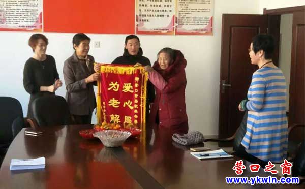 ( 營口之窗網(wǎng)訊 一帆)“我真感謝黨,感謝政府,感謝你們!”日前的一天上午,冒著嚴(yán)寒,83歲的低保老人劉文英,在外孫的攙扶下,步履蹣跚地來到養(yǎng)老和社區(qū)基本公共服務(wù)中心,將一面寫著“愛心服務(wù),為老解憂”的錦旗,送到領(lǐng)導(dǎo)手中,對服務(wù)表示真誠的感謝。