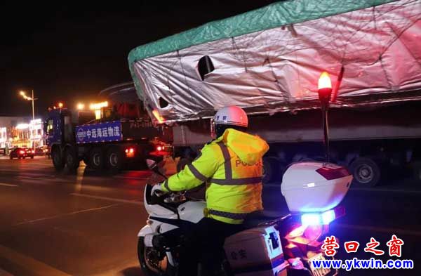 (營口之窗網(wǎng)訊 王宏鑫)3月27日22時(shí),一輛總重為240噸、長度31米、高度4.5米、車貨總寬達(dá)到14.5米的12軸超大件運(yùn)輸掛車運(yùn)抵營口港,該車裝載的是中國科學(xué)研究院國家重點(diǎn)研發(fā)項(xiàng)目的關(guān)鍵部件,營口開發(fā)區(qū)交警大隊(duì)負(fù)責(zé)沿途護(hù)送任務(wù)。