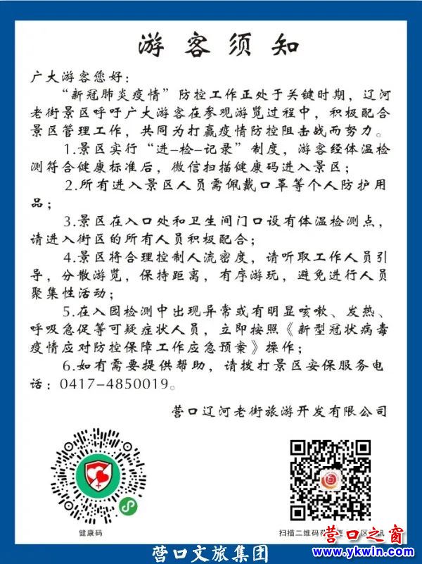營(yíng)口遼河老街景區(qū)呼吁廣大游客在參觀游玩過程中,積極配合景區(qū)管理工作,共同為打贏疫情防控阻擊戰(zhàn)而努力。