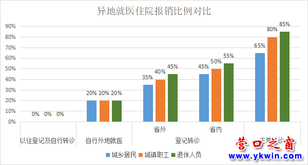 對(duì)于參保人患有我市醫(yī)院不能診治的疾病需要異地轉(zhuǎn)診住院的,由參保人申請(qǐng)、市直及各縣區(qū)中心醫(yī)院出具轉(zhuǎn)診手續(xù),可辦理異地轉(zhuǎn)診住院(起付線1000元,報(bào)銷比例:退休人員85%,在職職工80%,城鄉(xiāng)居民65%);對(duì)于參保人患病后雖然不符合異地轉(zhuǎn)診條件,但有意愿去異地住院治療,持相關(guān)診斷證明到醫(yī)保中心(含分中心)登記備案后,可辦理異地登記住院(起付線1500元,報(bào)銷比例:退休人員55%,在職職工50%,城鄉(xiāng)居民45%,需要說(shuō)明的是省外就醫(yī)住院報(bào)銷比例較省內(nèi)降低10%);對(duì)于遷往異地居住、投奔兒女或異地購(gòu)房、派出工作的符合異地轉(zhuǎn)診住院條件的參保人,可按規(guī)定辦理異地居住住院(起付線1000元,報(bào)銷比例:退休人員85%,在職職工80%,城鄉(xiāng)居民65%);對(duì)于參保人員外出探親、旅游或準(zhǔn)假外出期間在異地突發(fā)危、急、重病符合急診住院條件的,可按規(guī)定辦理異地急診住院(起付線1000元,報(bào)銷比例:退休人員85%,在職職工80%,城鄉(xiāng)居民65%)。
