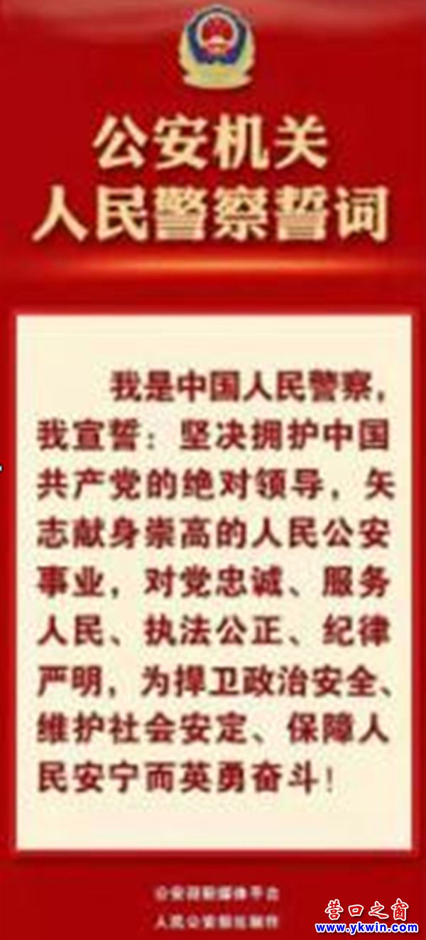 “我是中國人民警察,我宣誓:堅(jiān)決擁護(hù)中國共產(chǎn)黨的絕對(duì)領(lǐng)導(dǎo),矢志獻(xiàn)身崇高的人民公安事業(yè),對(duì)黨忠誠、服務(wù)人民、執(zhí)法公正、紀(jì)律嚴(yán)明,為捍衛(wèi)政治安全、維護(hù)社會(huì)安定、保障人民安寧而英勇奮斗!”