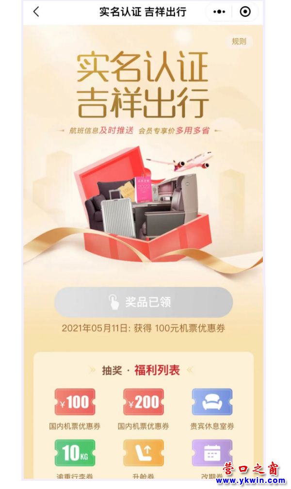 第一波獎(jiǎng)品:包括免費(fèi)升艙券、免費(fèi)改期券、免費(fèi)貴賓休息室券,以及面值100元或200元的機(jī)票優(yōu)惠券,以上獎(jiǎng)品隨機(jī)抽取一張。