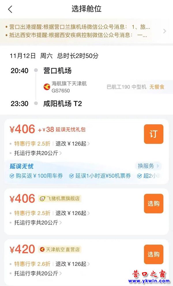 營(yíng)口=西安 單程406元起