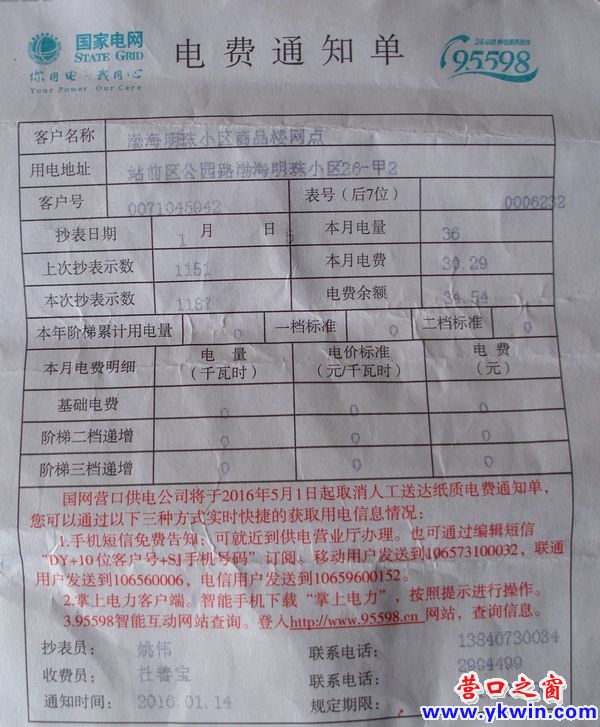 電費所貼出的通知,旁邊還附上了銀行交費網點的地址以方便用戶交費。