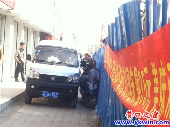 小貨車勉強(qiáng)的在人行道上倒車出去。