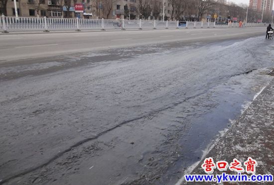 營口三干線寬闊的馬路有一半被凍成了溜冰場。