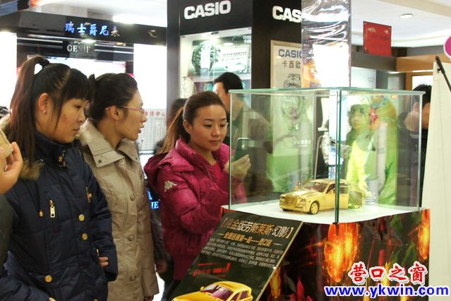 12月9日,在營口某超市,很多購物的市民圍著一臺(tái)造價(jià)500萬元的車模觀賞、拍照,據(jù)悉,營口市是主辦單位進(jìn)行純金版勞斯萊斯·幻影車模全國巡展的第一站。