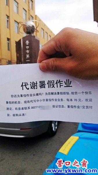 代‘謝’暑假作業(yè)的小廣告出現(xiàn)在營口市第一中學(xué)校門外。