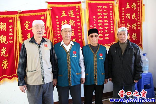 清真東寺主任戴德利(左一)、清真西寺主任戴明連(右一)與朝覲歸來的二位哈吉合影