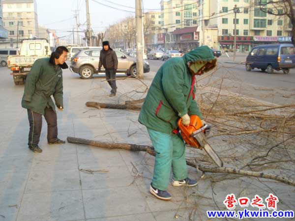 12月17日,營口園林工作人員來到站前區(qū)公園路邊剪樹枝。