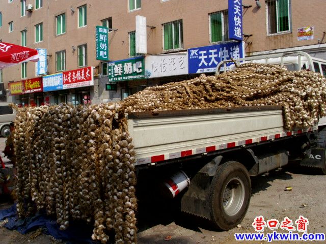 6月29日,一輛河北省的汽車滿載編成辮子的大蒜來到營口東福源馬路市場賣蒜,一辮才10元錢,相當(dāng)于兩元多一斤,比較便宜。