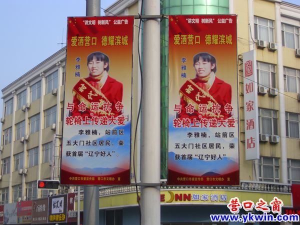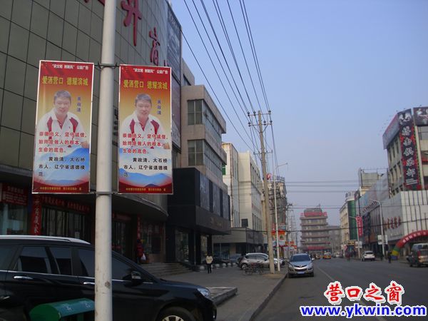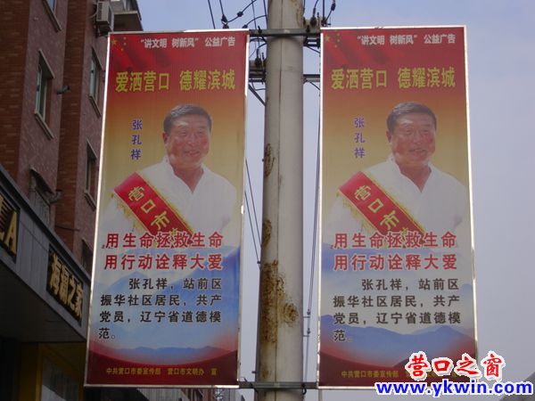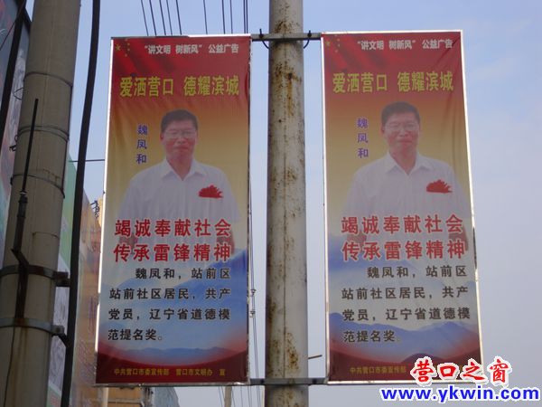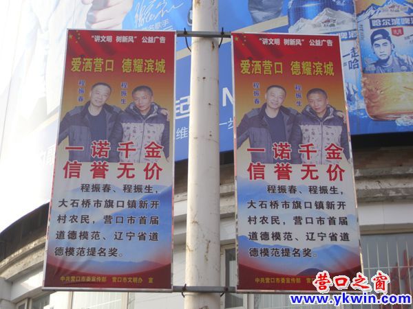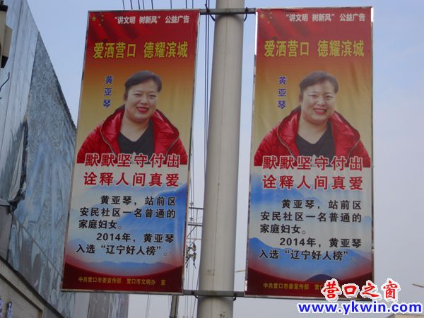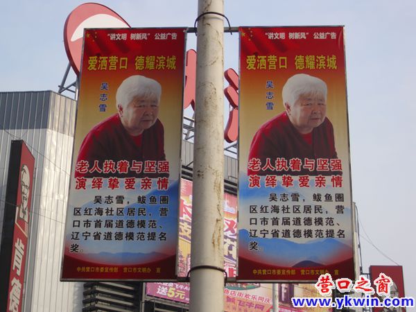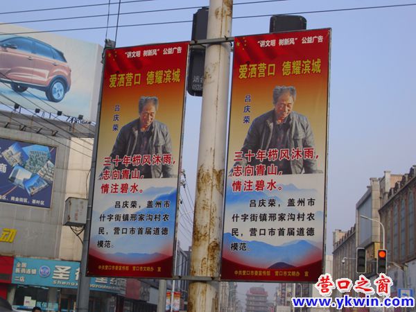 遼寧省道德模范提名獎(jiǎng)和營口市道德模范獲得者的大幅照片懸掛在了東升路西邊的電線桿上。