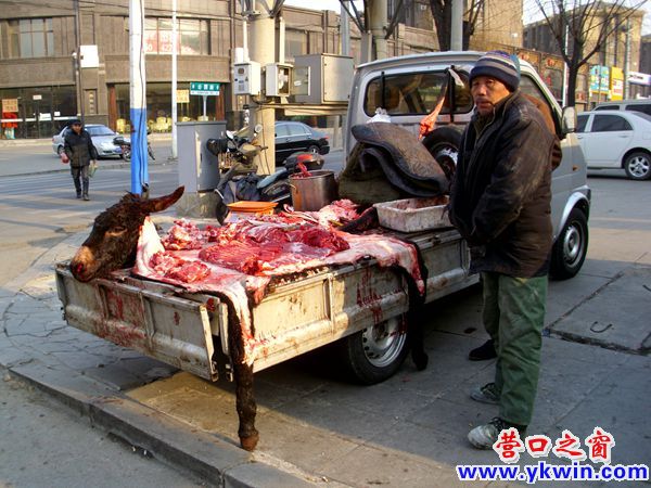 1月28日下午,營口公園路邊來了一個開車賣驢肉的商販。為了讓人相信他賣的驢肉是真的,他特意把驢頭驢皮驢蹄都帶來了一同出售。面對此情此景誰還能懷疑他賣的驢肉是假的呢?