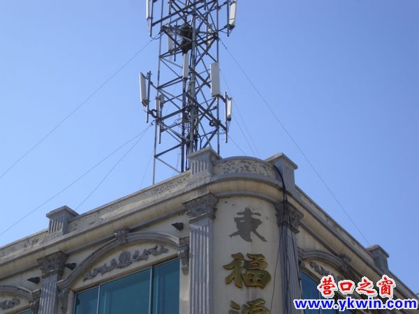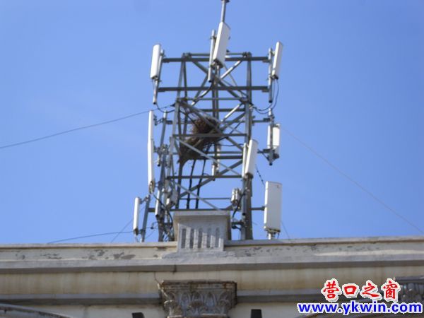 一只喜鵲在營(yíng)口公園路東福園市場(chǎng)樓頂?shù)氖謾C(jī)信號(hào)塔上歡叫,抬頭一看喜鵲旁邊還有一個(gè)喜鵲窩。