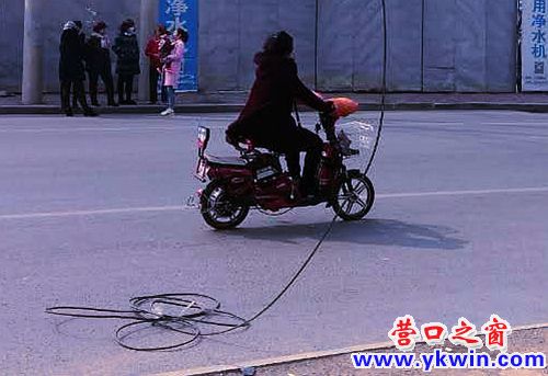 營口今天風(fēng)大,一陣風(fēng)吹來,非機(jī)動車道上纏繞的一團(tuán)電線也跟著擺動,來往行人只能繞著電線團(tuán)經(jīng)過,如果不小心軋?jiān)谏厦?,肯定會被絆倒,而且不知是否有電,希望相關(guān)部門盡快前來處理。
