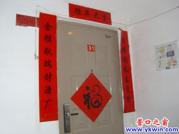 猴年, 營(yíng)口正隆小區(qū)的一戶居民家的門上貼了一個(gè)猴頭福字,這應(yīng)該算是字畫,有點(diǎn)標(biāo)新立異的味道。不過(guò),這個(gè)福字過(guò)了猴年就不適合貼了,明年是雞年,好事者不妨把猴頭換成雞頭再貼在