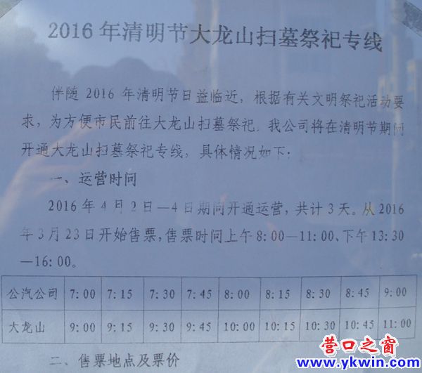 清明節(jié)期間,營(yíng)口市公汽公司為方便掃墓祭祀的市民,4月2日至4月4日特別開通老邊區(qū)大龍山公墓客運(yùn)專線,自3月23日起在營(yíng)口市公汽公司卡通中心預(yù)售車票。往返票價(jià)每人15元。時(shí)間表路線圖詳情見下面圖表。
