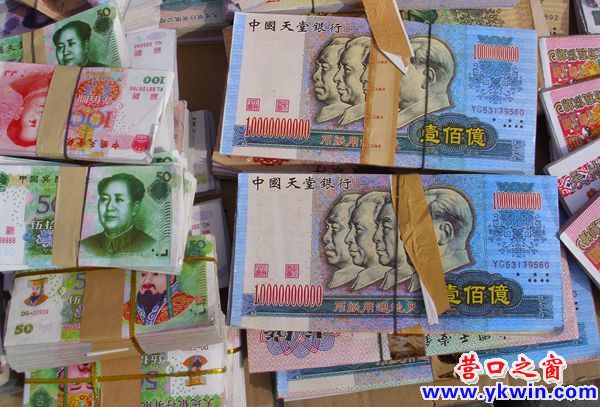 ?。丛拢橙?,營口東升路邊有人出售冥幣.走進(jìn)一看,這些冥幣多為人民幣圖案,而且是各個版本都有,面額有一億到一百億不等,上面寫著"中國天堂銀行".倘若中國真有天堂銀行,天堂銀行也不大可能盜版.