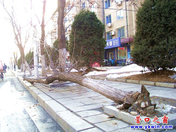 據(jù)觀察,前些日子狂風(fēng)肆虐在營口刮倒了很多樹,園林等部門該鋸的鋸,該扶的扶,差不多都處理完畢了??赡苁沁@棵倒樹地處偏僻的小馬路邊至今還沒有被園林部門發(fā)現(xiàn)才首次委屈的吧?