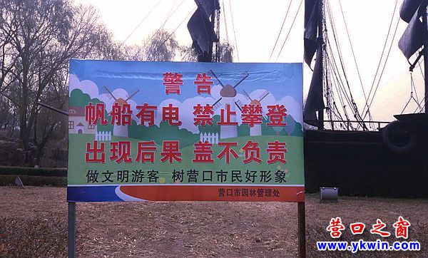 筆者發(fā)現,營口楞嚴寺公園內的提示牌 “帆船有電 禁止攀登 出現后果 蓋不負責”,其中“蓋”字寫錯,應為“概”字。