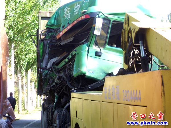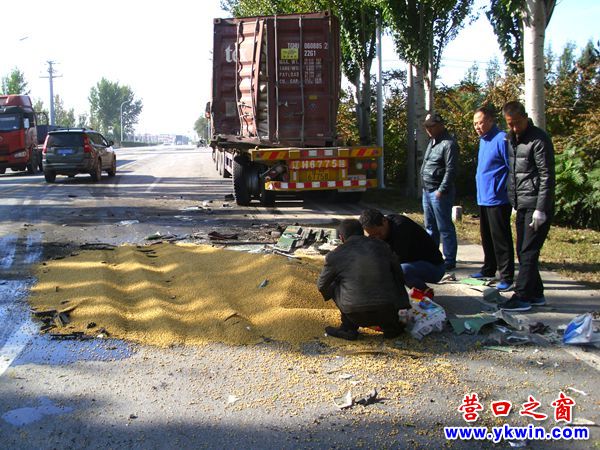 營口兩輛大貨追尾 前車大豆灑落一地