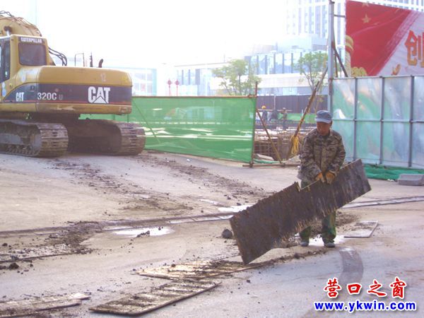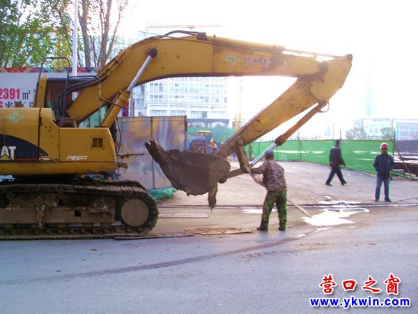 10月16日6點半,一輛抓鉤機從營口市原市府廣場建筑工地西側(cè)第二個門經(jīng)惠賓路進入第三個門。為了保護惠賓路,幾名跟隨的工人從抓鉤機駛?cè)牖葙e路到離開惠賓路所走過的路上一直用幾塊木板周而復始地輪番地墊在鏈軌的底下。即抓鉤機走走停停,停停走走;工人們反復地把木板從抓鉤機后面移到抓鉤機前面。就這樣,這段只有六七十米的路程抓鉤機一共走了十多分鐘。