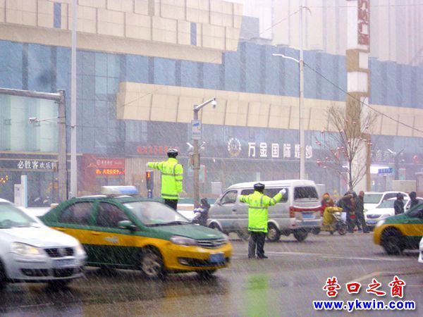 3月7日傍晚,營口的天空風雪交加。此時此刻,營口市青少年宮崗的一名女交警和大商新瑪特崗的兩名男交警頂風冒雪指揮交通的情景成為營口市渤海大街上最美的兩道風景。在他們的指揮下,行人行車有序地通過,沒有發(fā)生交通擁堵和車輛剮蹭的情況。