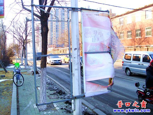 前日,經(jīng)過營口太白路,見到北端東側(cè)路邊燈桿上“右面畫布不翼而飛,左面畫布破舊飛邊”的宣傳牌從3米多高的安裝位滑落到幾乎貼地的超低空位并已妨礙了行人的通行。這塊既丑陋又擋道的宣傳牌亟待更新。