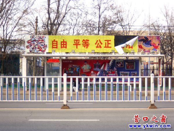 3月21日,沿著營(yíng)口市3路公交車(chē)的線(xiàn)路西行發(fā)現(xiàn)好幾個(gè)站的候車(chē)棚戴著破帽,如高新區(qū)服務(wù)中心站、交通學(xué)校站和第二高中站等。其中高新區(qū)服務(wù)中心站候車(chē)棚的帽子上寫(xiě)的“自由平等公正法治”加在一起剩下還不到半個(gè)字;交通學(xué)校站候車(chē)棚的帽子上寫(xiě)的“愛(ài)國(guó)敬業(yè)誠(chéng)信友善”合起來(lái)只有將近半個(gè)字;而第二高中站的候車(chē)棚只講“自由平等公正”不講“法治”……