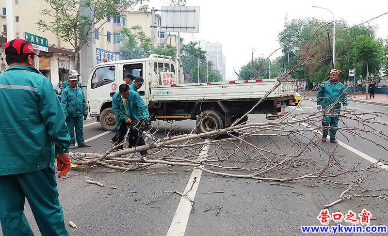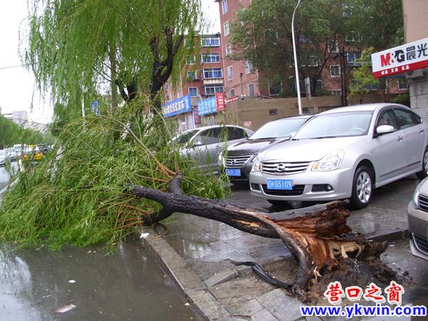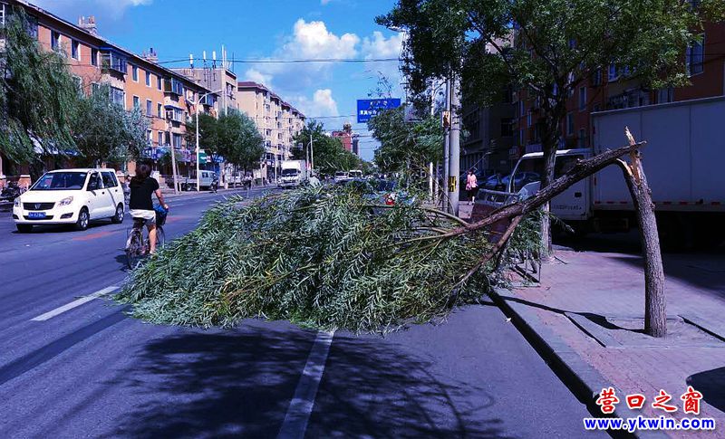 今天一場降雨,營口市新興大街中天新城小區(qū)外的一顆柳樹不堪重負倒下,整個樹冠部分將一側的道路覆蓋。