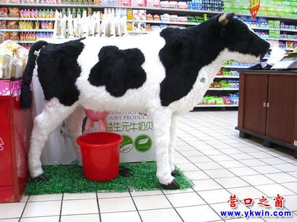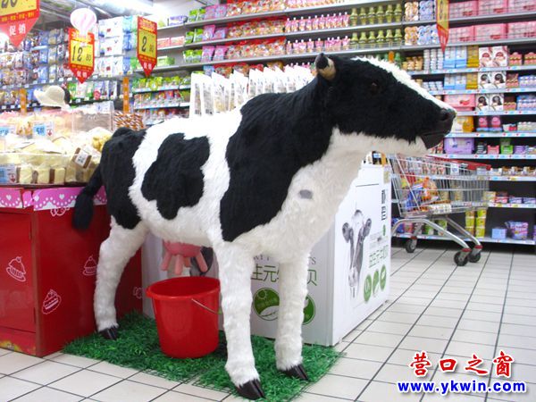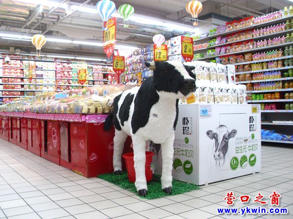8月16日,營口市大潤發(fā)超市乳制品區(qū)域一頭“奶牛”正在親自出售乳制品。顧客看到了“奶牛”也就找到了出售乳制品的準確區(qū)域和想到乳制品的來源。