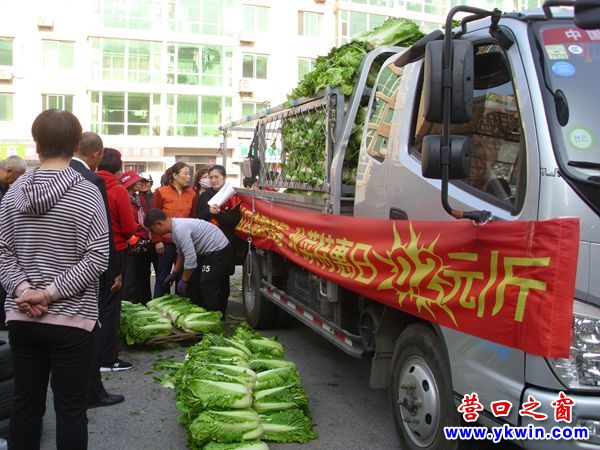 10月23日,營口銀行站前支行以0.25元一斤買了1萬斤大白菜,拉到營口市渤海明珠小區(qū)西大門口,以0.20元一斤低于市場0.05元的優(yōu)惠價賣給居民,結(jié)果不到一小時就搶購一空。