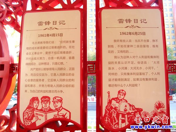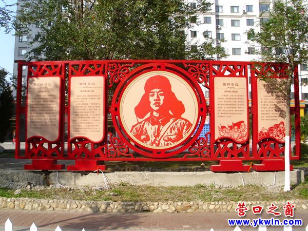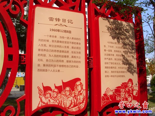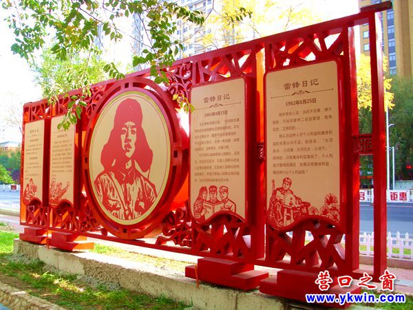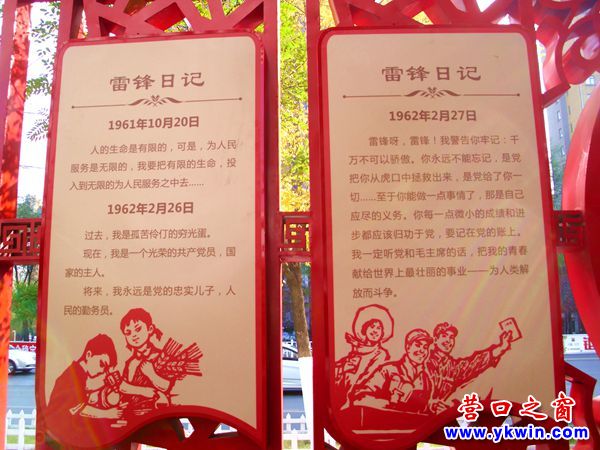日前,一個(gè)鑲嵌雷鋒畫像和雷鋒日記的巨幅宣傳牌被吊裝到營口市海天佳苑廣場。此舉使該廣場原有的雷鋒雕塑不再孤單。這個(gè)雷鋒宣傳牌正反兩面的中間都是鑲著雷鋒的畫像,兩邊都嵌著雷鋒日記。