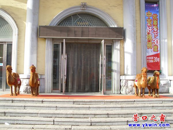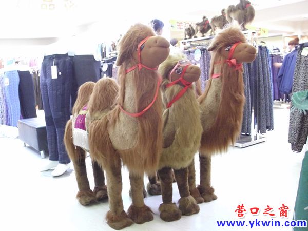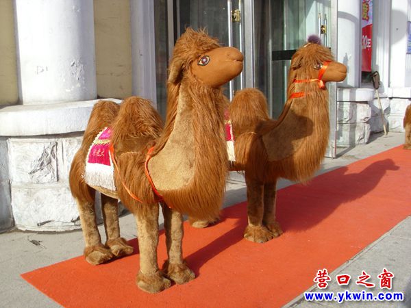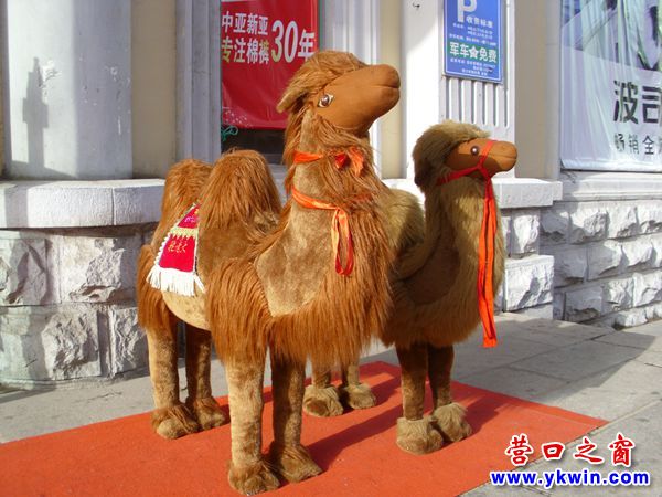 10月28日,逛位于營口市遼河大街邊的一爿服裝店,在門前意外受到了四峰“駱駝”的歡迎。原來,他們在用“駱駝”迎賓。在大門口,有用小姐迎賓的,如金店;有擺石獅的,如銀行;有放石象的,如酒店,而讓“駱駝”迎賓的以前還沒見過。