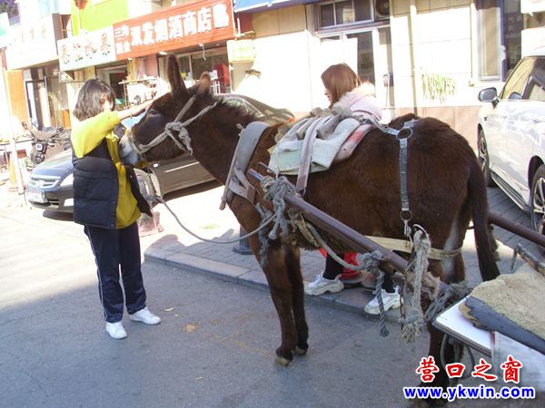 11月7日,我騎車經(jīng)過營口市東方路,見到兩個女孩正在拿著橘子喂一頭小毛驢,當(dāng)我下車拿出相準(zhǔn)備機(jī)拍照時,橘子已被小毛驢吃到了肚子里。原來,這輛水源鎮(zhèn)的小毛驢拉車進(jìn)城賣大米停在路邊。兩女孩因?yàn)橐姷揭褜嬴P毛麟角的小毛驢感到好奇就和它玩了一會。
