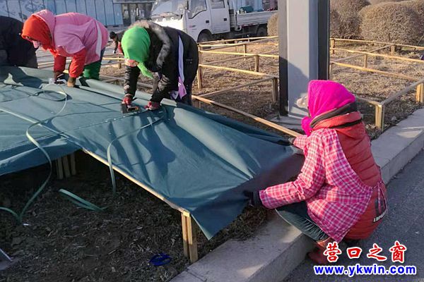 昨天,筆者在營(yíng)口市西市區(qū)民生路看到市公共設(shè)施維護(hù)集團(tuán)的雇用人員正在往路邊的綠化帶架好的木架上鋪設(shè)防寒罩,綠化帶好似披上了“防寒被”,我市綠化管養(yǎng)也正式進(jìn)入“御寒模式”。