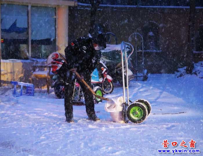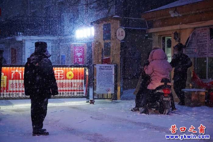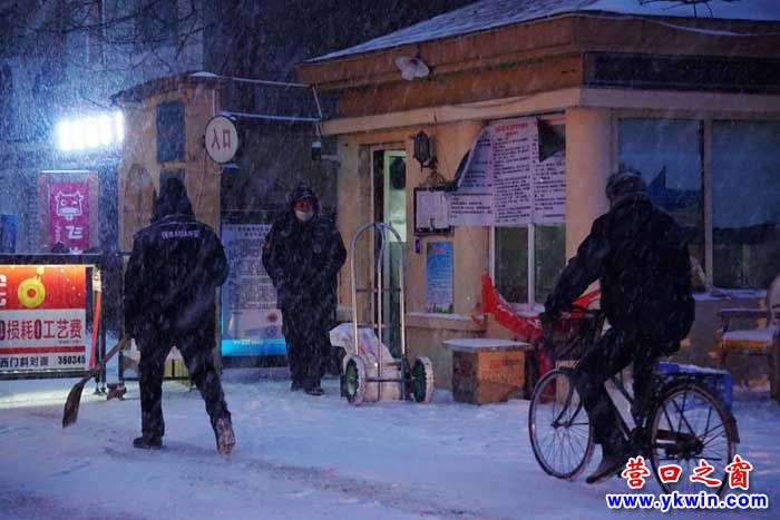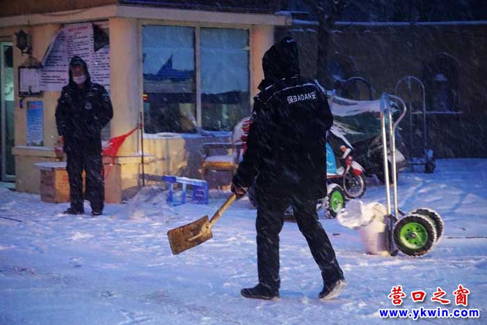 已經(jīng)夜晚,雪還在下。我在營口市城南公館小區(qū)看到了這里的物業(yè)人: