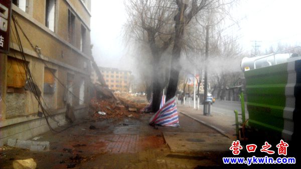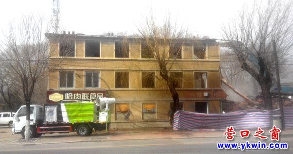 (營口之窗網(wǎng)訊 胡 然)3月20日,一臺(tái)抓鉤機(jī)正在拆除營口市人民公園北鄰的居民樓,現(xiàn)場(chǎng)粉塵彌漫。此刻,一輛噴霧車正在把水霧源源不斷地噴向飛揚(yáng)的粉塵,大團(tuán)的粉塵隨之紛紛落地,有效地減輕了空氣污染。