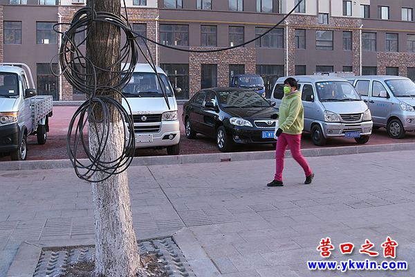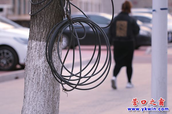 4月2日,營(yíng)口市西市區(qū)新興大街紅運(yùn)河畔新城小區(qū)東側(cè)人行道,一團(tuán)團(tuán)線(xiàn)纜掛在路旁樹(shù)干上,如此別致的“景色”出現(xiàn)在市區(qū)路旁,實(shí)在是大煞風(fēng)景。