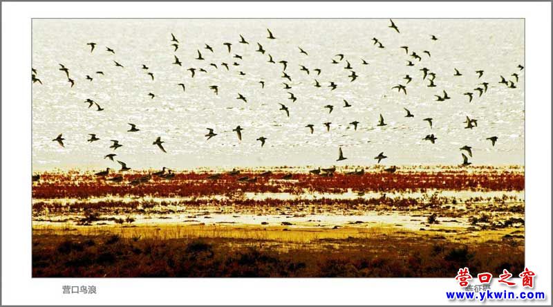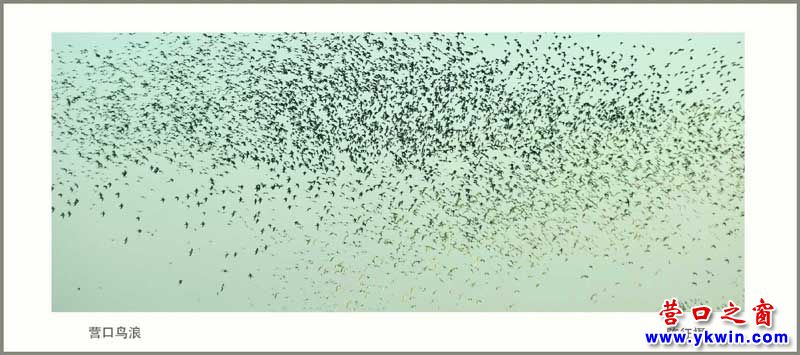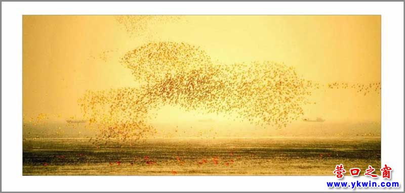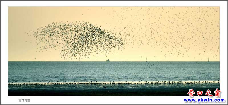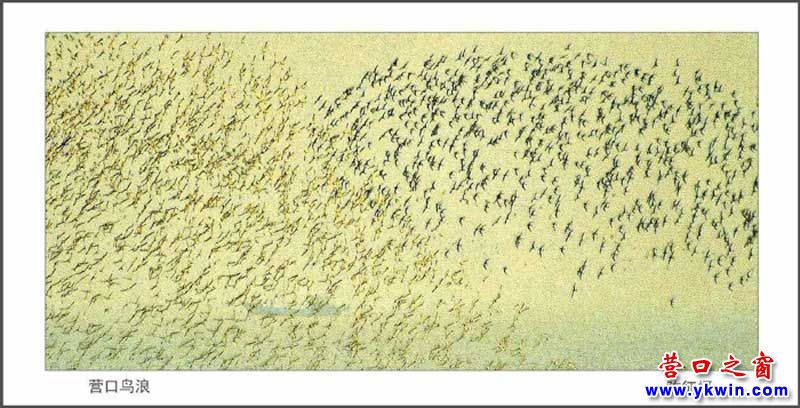 目前所知世界有8條候鳥遷徙路線,經(jīng)過我國主要有3條路線、而營口北從四道溝漁港南到華能電廠8公里的海岸線上就是候鳥從澳大利亞飛往西伯利亞的驛站。每年春秋兩季,上百萬只候鳥在此停歇、繁殖、補(bǔ)充能量,而后春天向北、秋天向南遷徙。潮落在灘涂覓食,潮滿騰飛而起,而起舞的各種造型,勢(shì)如駿馬奔騰、勢(shì)如龍飛鳳舞、勢(shì)如禮花滿天、勢(shì)如大鵬展翅、勢(shì)如群山連綿……。從而形成了波瀾壯闊令人贊嘆的營口鳥浪。