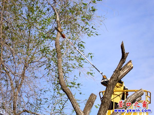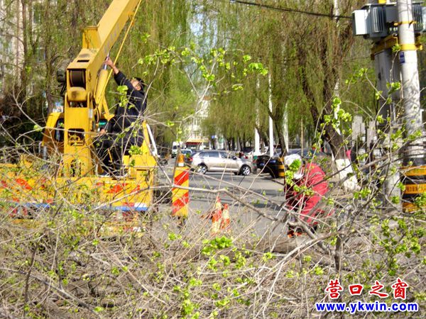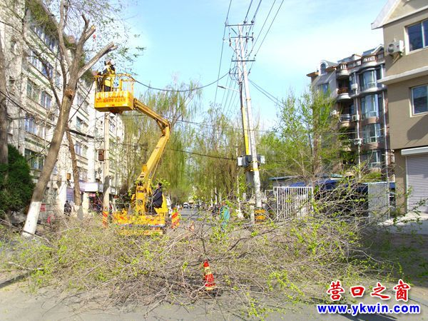 (營(yíng)口之窗網(wǎng)訊 胡 然)4月22日7點(diǎn)半多鐘,營(yíng)口市維護(hù)集團(tuán)出動(dòng)園林修剪人員將惠賓路惠安社區(qū)附近欺壓電線的一棵樹剃了光頭,所落樹杈臨時(shí)阻斷了交通,許多駛來(lái)的汽車見到此路不通紛紛調(diào)頭離去。